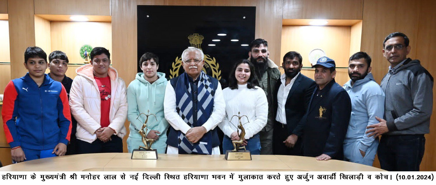 चंडीगढ़, 10 जनवरी – हरियाणा के मुख्यमंत्री श्री मनोहर लाल ने अर्जुन अवार्ड से पुरस्कृत प्रदेश के खिलाड़ियों को सम्मानित किया। नई दिल्ली स्थित हरियाणा भवन में अर्जुन अवार्डी खिलाड़ी व कोच मुख्यमंत्री मनोहर लाल से मुलाकात करने आए थे। मुख्यमंत्री ने राष्ट्रीय खेल पुरस्कार 2023 के तहत अर्जुन अवार्ड से सम्मानित सुनील कुमार (कुश्ती), अंतिम पंघाल (कुश्ती) व दीक्षा डागर (गोल्फ) को बधाई दी।