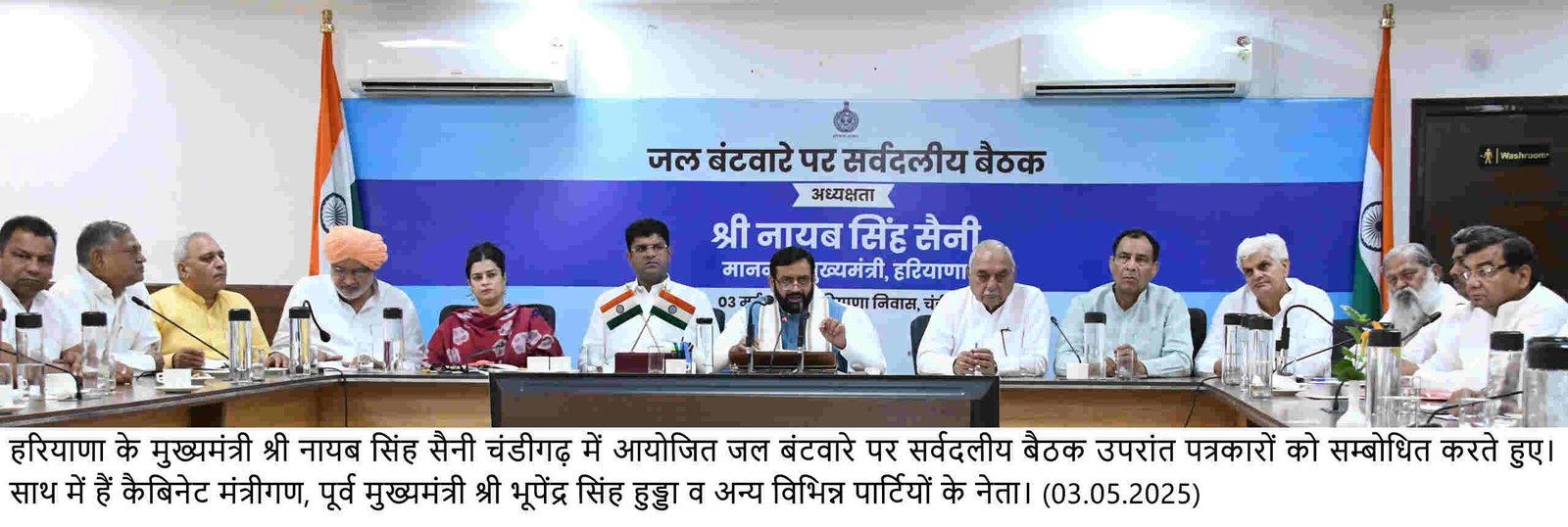 चंडीगढ़, 3 मई – हरियाणा और पंजाब के मध्य चल रहे जल विवाद पर आज मुख्यमंत्री श्री नायब सिंह सैनी की अध्यक्षता में सर्वदलीय बैठक हुई, जिसमें हरियाणा के हितों की सुरक्षा के लिए सर्वसम्मति से प्रस्ताव पास करके पंजाब सरकार से आग्रह किया गया कि बीबीएमबी की तकनीकी समिति के 23 अप्रैल, 2025 के तथा बीबीएमबी बोर्ड के 30 अप्रैल, 2025 के फैसलों को बिना शर्त लागू किया जाए। हरियाणा को मिलने वाले पानी के हिस्से पर लगाई गई अमानवीय, अनुचित, अवैध एवं असंवैधानिक रोक को तुरंत हटाया जाए।