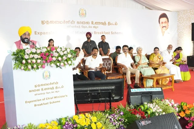 मुख्यमंत्री ने तमिलनाडु के लोगों, विशेष रूप से एम.के. स्टालिन का इस समारोह में मुख्य अतिथि के रूप में आमंत्रित करने के लिए धन्यवाद दिया। उन्होंने कहा कि यह निमंत्रण केवल व्यक्तिगत गर्व की बात नहीं है, बल्कि यह सभी पंजाबियों के लिए गर्व का क्षण है। भगवंत सिंह मान ने कहा कि इस योजना के तहत अब तमिलनाडु के शहरी क्षेत्रों के सभी सरकारी सहायता प्राप्त स्कूलों के छात्रों को सुबह का भोजन प्रदान किया जाएगा।