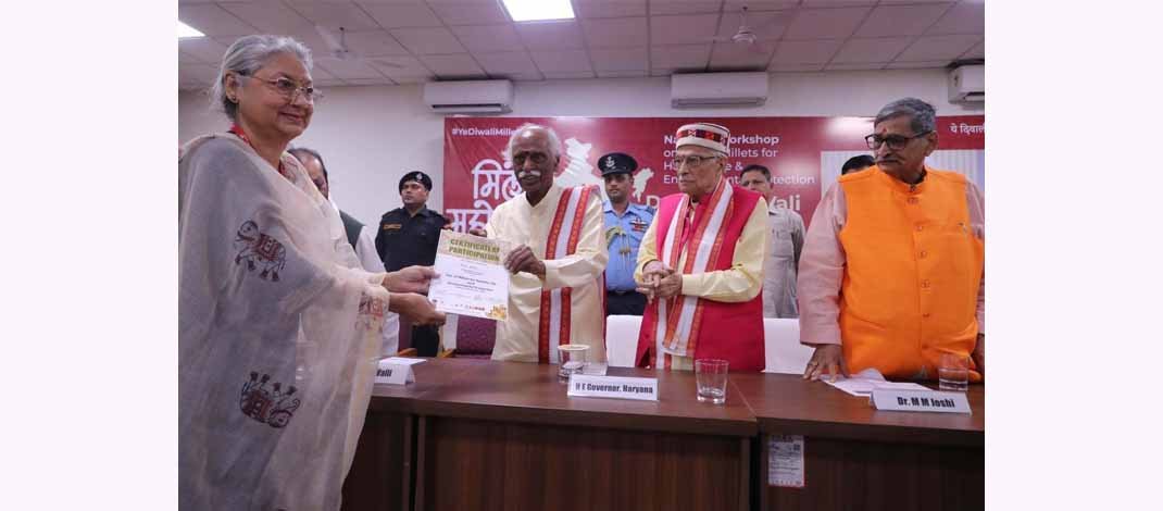 चंडीगढ़, 8 नवंबर- राष्ट्रीय राजधानी दिल्ली में ‘मोटे अनाज का उपयोग स्वस्थ मानव जीवन व सुरक्षित पर्यावरण’ विषय पर तीन दिवसीय राष्ट्रीय सेमीनार आयोजित किया गया। इस सेमिनार का समापन समारोह मंगलवार देर सायं आयोजित किया गया जिसमें हरियाणा के राज्यपाल श्री बंडारू दत्तात्रेय ने शिरकत की। श्री दत्तात्रेय ने भोजन में मोटे अनाज के उपयोग पर बल देते हुए कहा कि मोटा अनाज सेहत के लिए अत्यंत फायदेमंद है इसलिए इसे अपने दैनिक भोजन में जरूर शामिल करें।