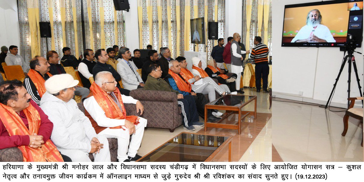 आर्ट आफ लिंविंग के प्रेणता श्री श्री रविशंकर वीडियो कांफ्रेसिंग के माध्यम से विभानसभा सदस्यों से रूबरू हुए। उन्होंने मुख्यमंत्री श्री मनोहर लाल को बधाई दी कि उनकी सरकार कुशल नेतृत्व के साथ-साथ सामाजिक सरोकार पर विशेष जोर दे रही है। इसके साथ ही किसानों की भलाई के लिए फसल विविधिकरण को बड़े स्तर पर लागू किया है, जिससे किसान खुशहाल हुए हैं। उन्होंने कहा कि नकारात्मक सोच के लोग ज्यादा सक्रिय रहते हैं और समाज की हानि का प्रयास करते हैं। सकारात्मक सोच के लोगों को ज्यादा सक्रिय होकर उनकी सक्रियता को कम करना होगा, ताकि समाज की भलाई हो सके। उन्होंने योगासन के लाभ बताए और तनाव से मुक्त रहने के टिप्स दिए। व्यक्ति को प्रतिदिन 15 मिनट ध्यान योग करना चाहिए। इससे उनके विचार सकारात्मक होंगे और नींद भी गहरी आएगी। शरीर में ताजगी बनी रहेगी। श्री श्री रविशंकर ने सभी सदस्यों का आह्वान किया कि वे प्रतिदिन गीता का जरूर अध्ययन करें, इससे उनके सोचने व निर्णय लेने की क्षमता में उत्तरोत्तर विकास होगा।